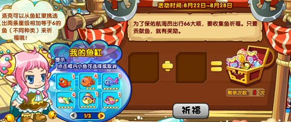 3、鱼选好后就能点击祈福了运气好的话会拿到果儿糖、孵化宝典、攻击之果之类的奖励,当然还有洛克贝啦。洛克王国出航大顺活动每天只能祈福5次哦~