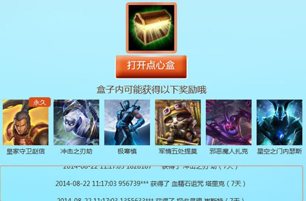 活动期间,每天只要打完2局召唤师峡谷5V5对战(包括普通匹配、人机对战及排位赛),即可获得一次打开点心盒的机会,点击按钮就可以查看点心盒里面的奖励。如果打开点心盒没有抽到皮肤也没关系哦,因为你可以根据累计打开的点心盒数量来领取免费的头像奖励。