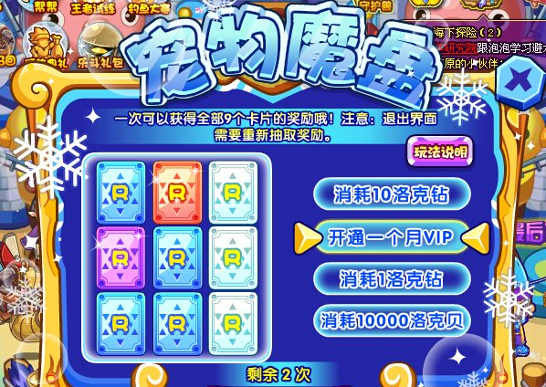 2、在点击转动魔盘的时候,一次可以获得全部9个卡片,每种颜色卡片的奖励都不同,抽到紫卡的将会获得珍稀宠物。在9个卡片确定下来的时候,会随机一种奖励方式(右边),这时候需要你完成他要求的奖励方式才可获奖哦~