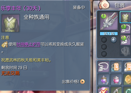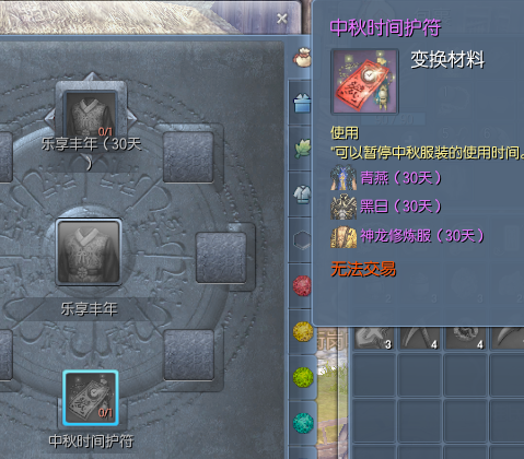 今天做的日常 很高兴开出来这件衣服 而且是30天的。虽然我点卷不够买 时间停止符 但是 衣服的时间还够我等...可以从截图上面看到 上面写着 注意 使用 时间停止护符可以将其变换成永久服装。面写的是 中秋时间护符 使用是可以暂停中秋服装的使用时间。那么这个中秋时间护符可不可以将中秋服装变成永久的呢?这个现在小编还不好说,智能根据以往的特点进行推测。