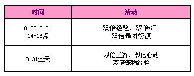 8月30日至8月31日每天14点至16点将开启双倍经验、双倍G币、双倍舞团资源活动。8月31日全天全天将开启双倍工资、双倍心动、双倍宠物经验活动。