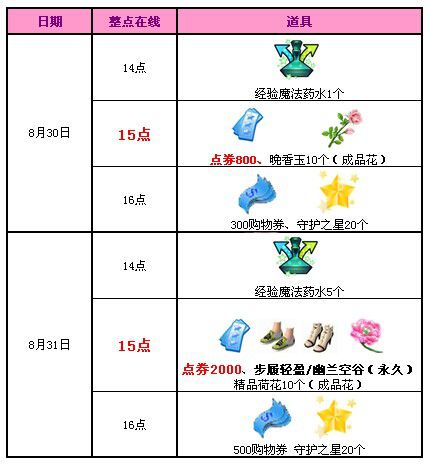 8月30日至8月31日每天15点至16点30分期间,累积在线30分钟、60分钟,即可轻松获得宠物用品、神秘钥匙、黄金卡片等热门道具。