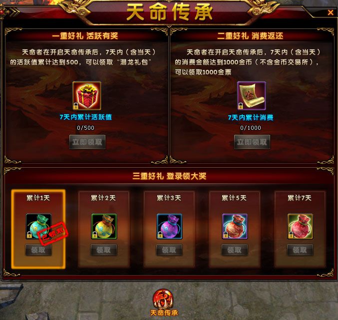 注意:入口开启时间为使用“天命传承”当日开始7天,以自然日为准;
