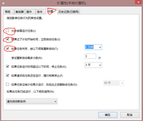 在“设置”选项卡中,将“允许按需运行任务”前的勾去掉,勾选“如果过了计划开始时间,立即启动任务”和“如果任务失败,按以下频率重新启动”。