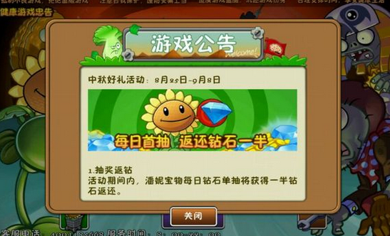 8月25日-9月8日,玩家使用潘妮宝物每日首次钻石单抽将获得一半钻石返还,还可以在商店一步到位地进阶植物和获得装扮,更有包含冰西瓜、充能柚子、寒冰射手、全息坚果等超多植物的限时奖品等你带回家!
