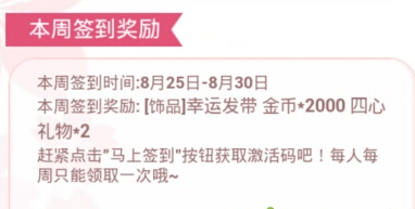 本周签到奖励:饰品、幸运发带、金币*2000、四心礼物*2