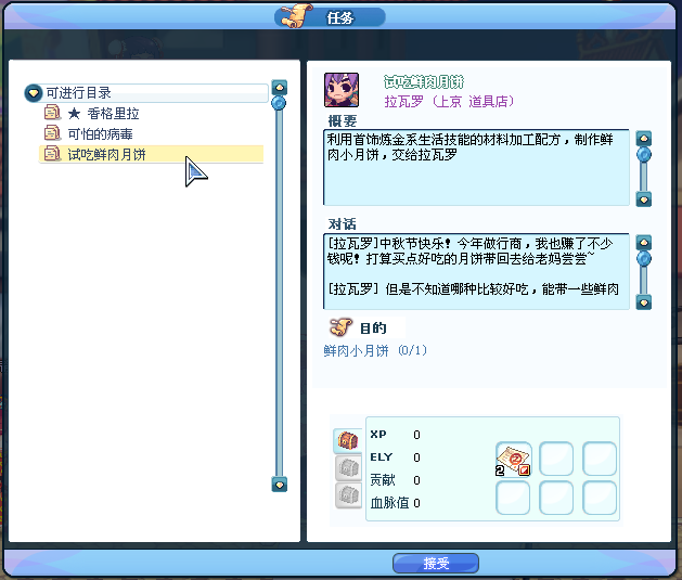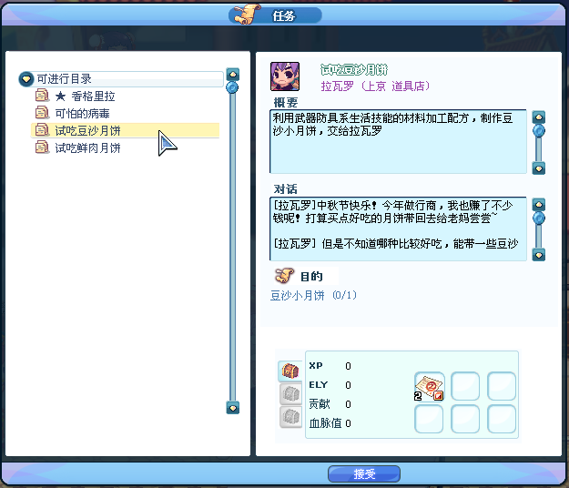 根据任务提示/需求制作出豆沙月饼或鲜肉月饼即可完成任务获取道具:拍卖券!