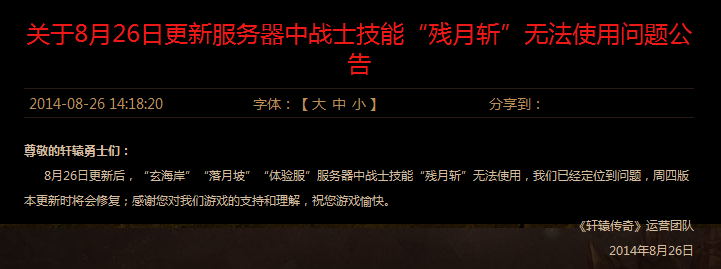 8月26日更新后,“玄海岸”“落月坡”“体验服”服务器中战士技能“残月斩”无法使用,我们已经定位到问题,周四版本更新时将会修复;感谢您对我们游戏的支持和理解,祝您游戏愉快。