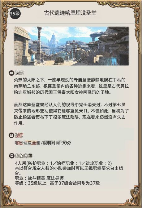 FF14从35级副本古代遗迹喀恩埋没圣堂开始,推荐以特职类(如战士骑士)参加,不推荐继续以基础职业(如斧术剑术)继续混副本。古代遗迹喀恩埋没圣堂副本整个流程都是单一路线,没有什么分支,顺路走就行,遇到石板就捡起来。