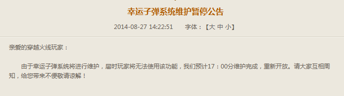 今天好多玩家反映,说幸运子弹系统不能用了,很多玩家都感到很郁闷的,不知道问题出在哪?有的悲催玩家甚至还重装自己的游戏,结果任然不能用幸运子弹。正在玩家朋友们最苦恼的时候官方在下午的时候及时给出了公告。原来是幸运子弹系统在维护,所以该系统暂停了。好了,东坡小编接下来,给大家介绍一下最新的公告详情。