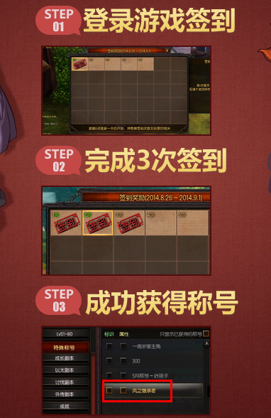 2、参与条件:已拥有内测资格的用户,在活动时间内登录游戏,在游戏内的签到面板上签到,在5天内完成3次签到即可获得“风之继承者”称号,账号下首个完成签到的角色获得称号(其他角色不获得)