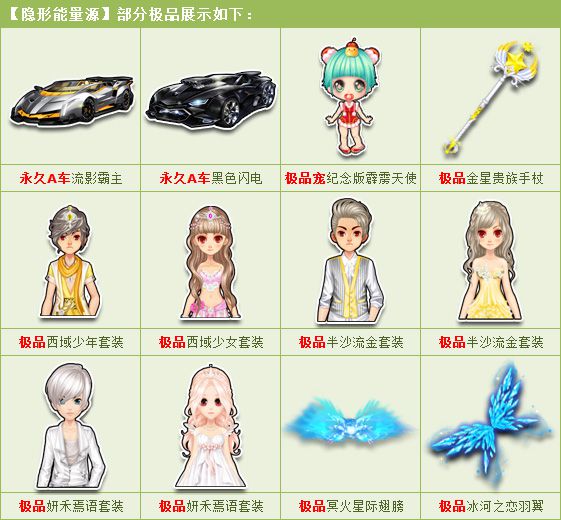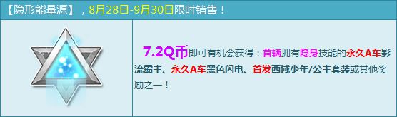 QQ飞车8月28日-9月30日,只需要在商城购买“隐形能量源”,开启就有机会获得首辆拥有隐身技能的永久A车影流霸主、永久A车黑色闪电、首发西域少年/公主套装或其它奖励之一,现在只需要7.2Q币就有机会获得!