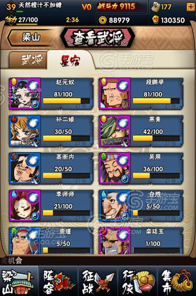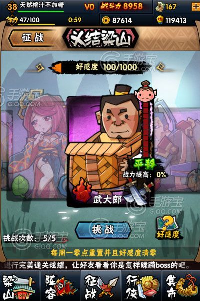 在义结梁山中共有三个武将可以被征战,这三个武将每周会更新一次,每个武将的初始好感度为0,上限为1000,玩家每天可挑战5次,挑战后的好感度会慢慢累积,若全部获胜则可以获得400好感度。