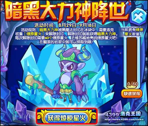 洛克王国暗黑大力神活动在8月29日开启了,洛克王国暗黑大力神怎么得?暗黑大力神被黑魔法封印在冰块中,需要小洛克们收集道具燎原星火来解除封印,下面东坡小编就给大家详细介绍洛克王国暗黑大力神获得方法。