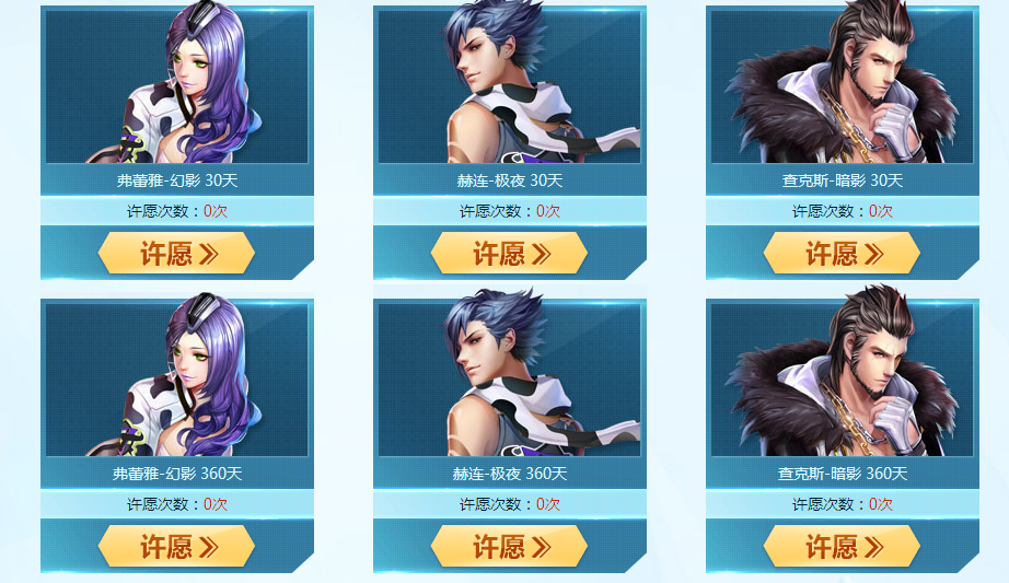 在游戏商城中购买了幻影系列任意角色的玩家,可根据自己的消费记录许愿,获得当前角色期限加倍 or 368Q币礼包大奖!