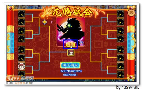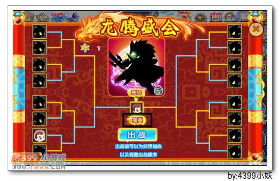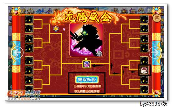 进入“龙腾盛会”,挑战分为,4场多妖战,1场随机黑白煞boss战。首先我们要抽取随机妖怪来作为我方对战阵营。