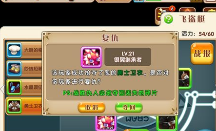 飞盗艇就是一个有来有往的地方。你掠夺别人的碎片,别人也可以掠夺你的。所以当自己的碎片被强走时,玩家可以选择复仇,只要战胜仇人,就一定能夺回丢失的碎片。不过也要注意看对方的等级,超过自己太多还是别去浪费时间和活力了。