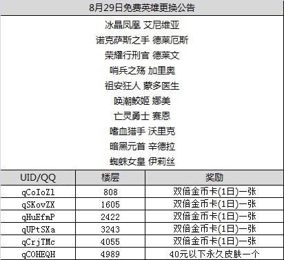 1、猜中每周免费英雄10个中的任意1个,送双倍金币卡(1日)一张,限量5张,随机抽取,送完即止