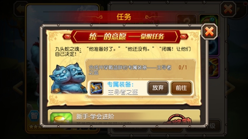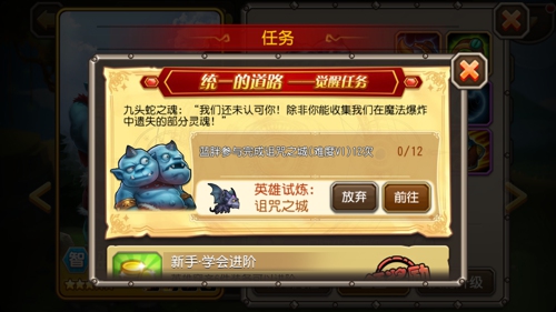 第一步是合成专属装备,这一步主要依靠队长们勤劳的小手。第二步,参与完成诅咒之城副本,该副本属于魔法免疫,更多依赖于物理DPS输出和蓝胖嗜血术BUFF,这一步要考验到玩家的英雄搭配和英雄板凳深度。觉醒任务最后一步,是单挑第11章普通“双头”副本,蓝胖对蓝胖!