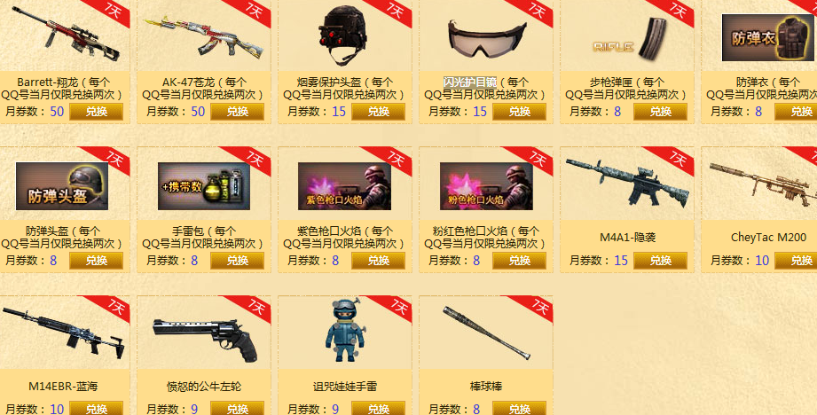 Barrett-翔龙(每个QQ号当月仅限兑换两次)、AK-47苍龙(每个QQ号当月仅限兑换两次)、烟雾保护头盔(每个QQ号当月仅限兑换两次)、闪光护目镜(每个QQ号当月仅限兑换两次)、步枪弹匣(每个QQ号当月仅限兑换两次)