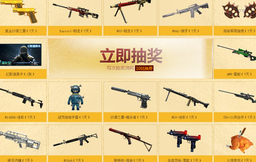 黄金沙漠之鹰、Barrett-翔龙、MG3-翔龙、M4A1-狼牙、熔岩军用指虎、幻影道具卡、AMW-雷蛇等