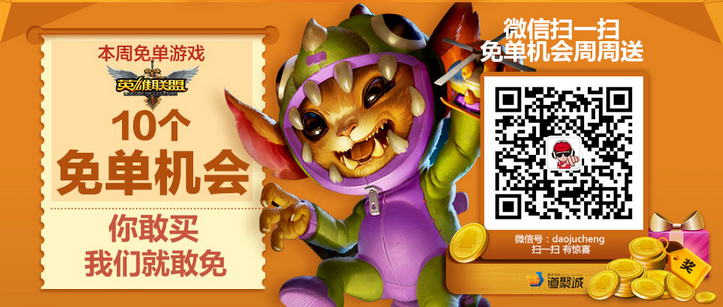 据悉,lol开启了关注道聚城微信号免单机会周周送活动,根据活动介绍,玩家只要在2014年8月29日-9月04日活动期间,关注道聚城微信号就有机会获得免单机会,下面就和小编一起来看看lol关注道聚城微信号免单机会周周送活动地址及相关详情介绍