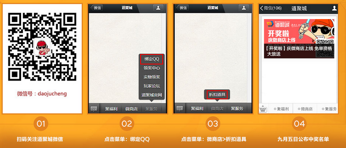关注道聚城微信号,通过菜单中的“微商店”>“折扣道具”成功购买指定游戏的任意道具,并且绑定自己的QQ帐号,每周都有机会被幸运女神砸中“免单”哦。
