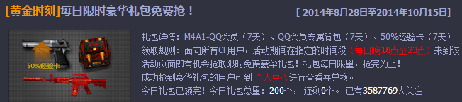 面向所有CF用户,活动期间在指定的时间段(每日晚18点至23点)来到该活动页面即有机会抢取限时免费豪华礼包!礼包每日限量,抢完为止