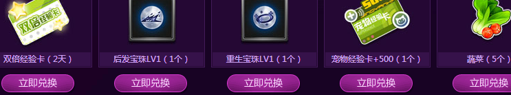 双倍经验卡(2天)、后发宝珠LV1(1个)、重生宝珠LV1(1个)、宠物经验卡+500(1个)、蔬菜(5个)
