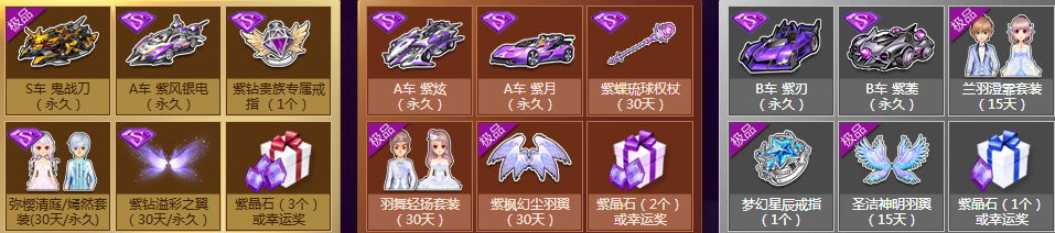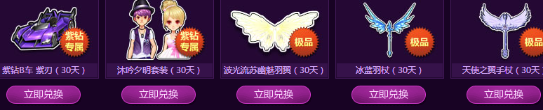 紫钻B车 紫刃(30天)、沐吟夕明套装(30天)、波光流苏幽魅羽翼(30天)、冰蓝羽杖(30天)、天使之翼手杖(30天)