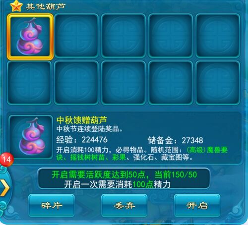 签到还能获得额外的中秋葫芦,前往宝库开启之后可以获得下述随机奖励: