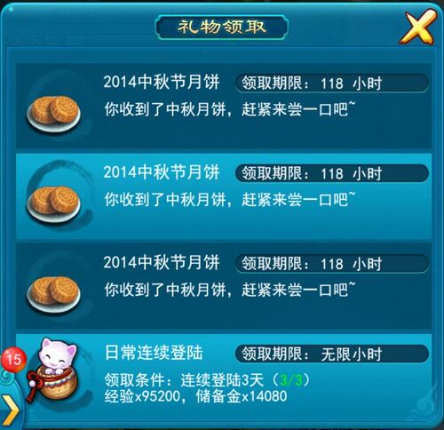 中秋节活动期间,连续登陆满3天即可获得中秋奖励~