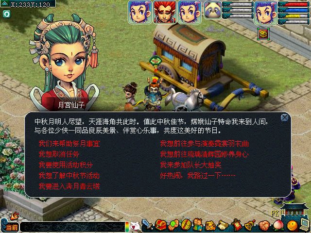 中秋佳节,三界共庆,各处月饼飘香,家家欢聚一堂……月宫仙子奉嫦娥之命,下界与大家一起欢度中秋。各位少侠可在长安城(244,117)月宫仙子处领取任务,帮助月宫仙子筹备拜祭月神事宜。当完成的环任务达到一定数量后,晚上20:00-22:00期间,月宫仙子还会在各大主城设下美味大月饼,供少侠品尝哦。