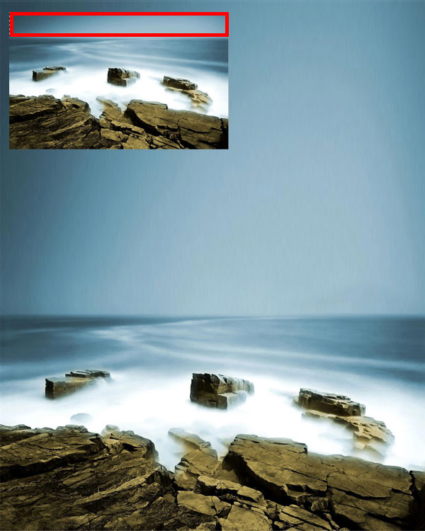 用矩形选取工具,把背景图上方的一部分选取,下图标了红色框的~按CTRL+J复制图层,然后CTRL+T把它拉到画布顶端。