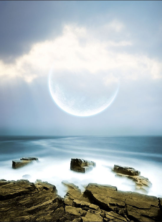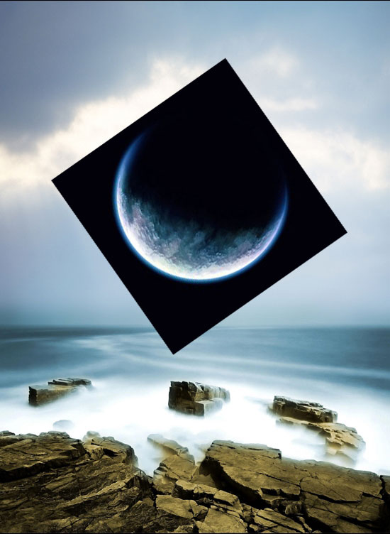 这里我们就把星球加进去,然后按CTRL+T旋转他,如图6,放好后到混合模式里面选择“滤色”,效果就是图7那样的