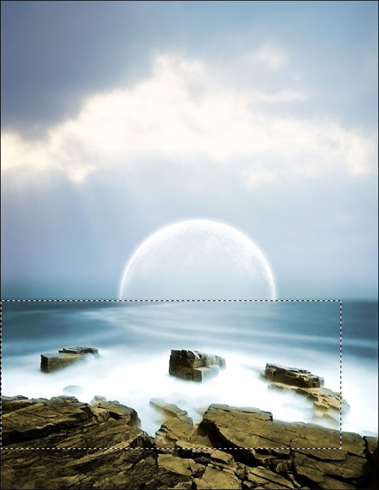 然后我们将星球移动到地平线中间,然后选择矩形选取工具,把海平面的地方删掉,这里最后先复制一个星球图层,怕到时候没做好麻烦。