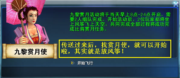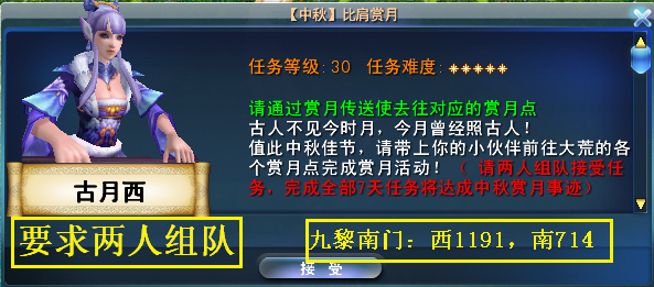 组队到九黎南门NPC古月西处接受任务,并通过赏月活动传送NPC今月明传送到指定位置找到赏月使,开启赏月飞行,完成完整的赏月飞行后将达成任务。