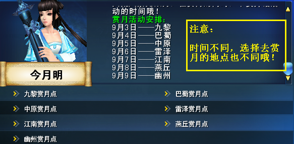 (注意事项:赏月活动每天开放的位置不同,请选择传送到正确的活动地区,成功完成全部七个地区赏月活动的玩家将达成中秋赏月事迹。)