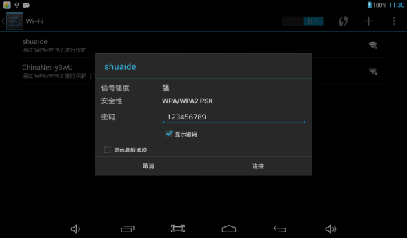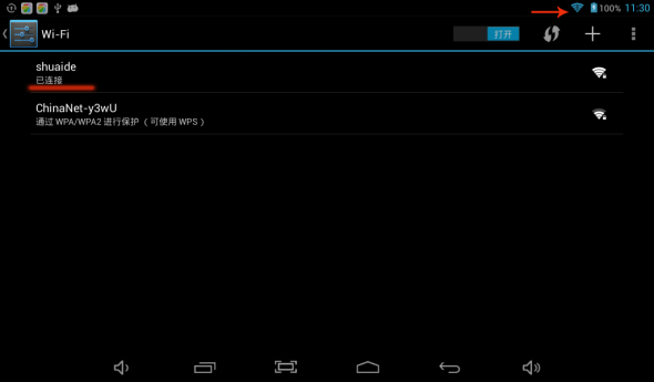 链接成功后,会在WiFi热点名字下面显示已连接,在显示屏的右上角时间的旁边,也有信号的强度标示。