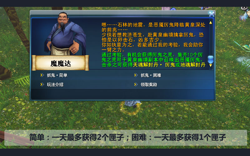 通过上面玩法,每天最多可以得三个匣子,开启有一定几率获得厉鬼之灵,在黄泉幽静击杀无常之后,会出一个NPC