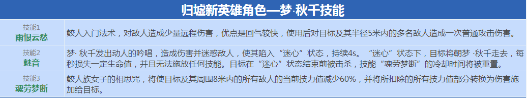 梦· 秋千发出动人的吟唱,造成伤害并迷惑敌人,使其陷入“迷心”状态,持续4s。“迷心”状态下,目标将朝梦 ·秋千走去,每秒损失一定生命值,并且无法施放任何技能。目标在“迷心”状态结束前被击杀,技能“魂劳梦断”的冷却时间将被重置。