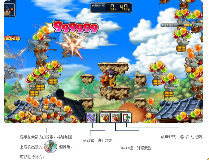 活动方法:13级以上角色每小时15、45分可以接受活动提示移动到活动地图,击落乘坐气球偷走粮食的老鼠,获得分数!
