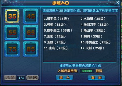 宠物迷城依据宠物的参战等级来分层,进入每层所需银两有所不同。