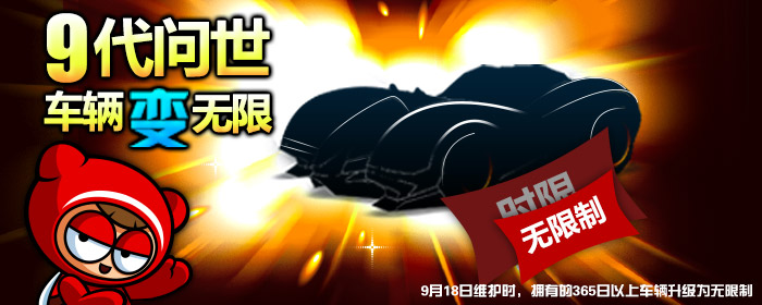在九代概念车震撼来临的同时,《跑跑卡丁车》还为广大玩家带来了相应的纪念活动。从9月4日到24日,为庆贺九代概念车的登场,游戏内彩色齿轮将会进行4折销售,1个彩色齿轮的价格将会从原先的68游戏币变成28游戏币。与此同时,战略补给箱C也会华丽升级,玩家使用之后,可以获得任意1款HT+车辆,并且还有机会将九代概念车、魔怪 HT+黄金版、New棉花糖黄金版、 黄金猎犬HT+等超人气车辆收入囊中。