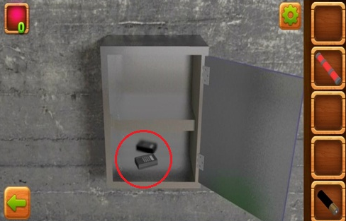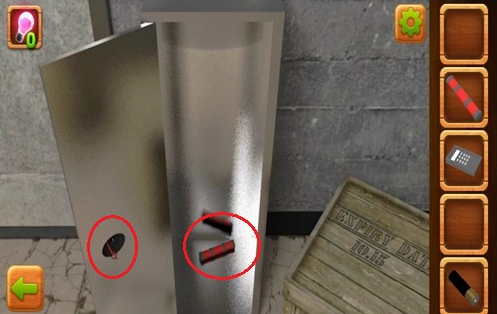 9、用拿到的钥匙打开门旁右边的铁柜,打开后取得另一个炸药管以及在钥匙孔内拿到电线,并记住木箱上的数字1015。