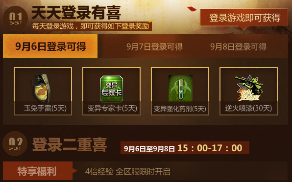 1、中秋节期间(9月6日至9月8日)每天登录游戏,即可获得一份登录礼包,每个Q号仅限获得一次,活动期间累计可获得3份礼包;