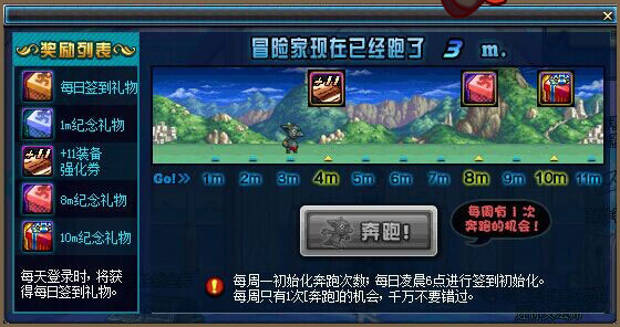 活动期间,每个帐号每周可获得一次奔跑机会,点击活动窗口的【奔跑】按钮即可获得【1m纪念礼物】。