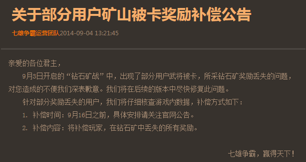七雄争霸关于部分用户矿山被卡奖励补偿公告