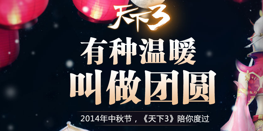 天下3陪你过2014年中秋节了,天下3为大家准备了4大活动,分别是阖家品月饼、齐聚猜灯谜、比肩赏秋月、佳节收礼品,下面东坡小编就给大家分享天下2014中秋节活动详细介绍吧。