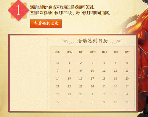 2、活动期间角色当天登录过游戏即可签到。签到1次获得中秋月饼1块,凭中秋月饼即可抽奖。